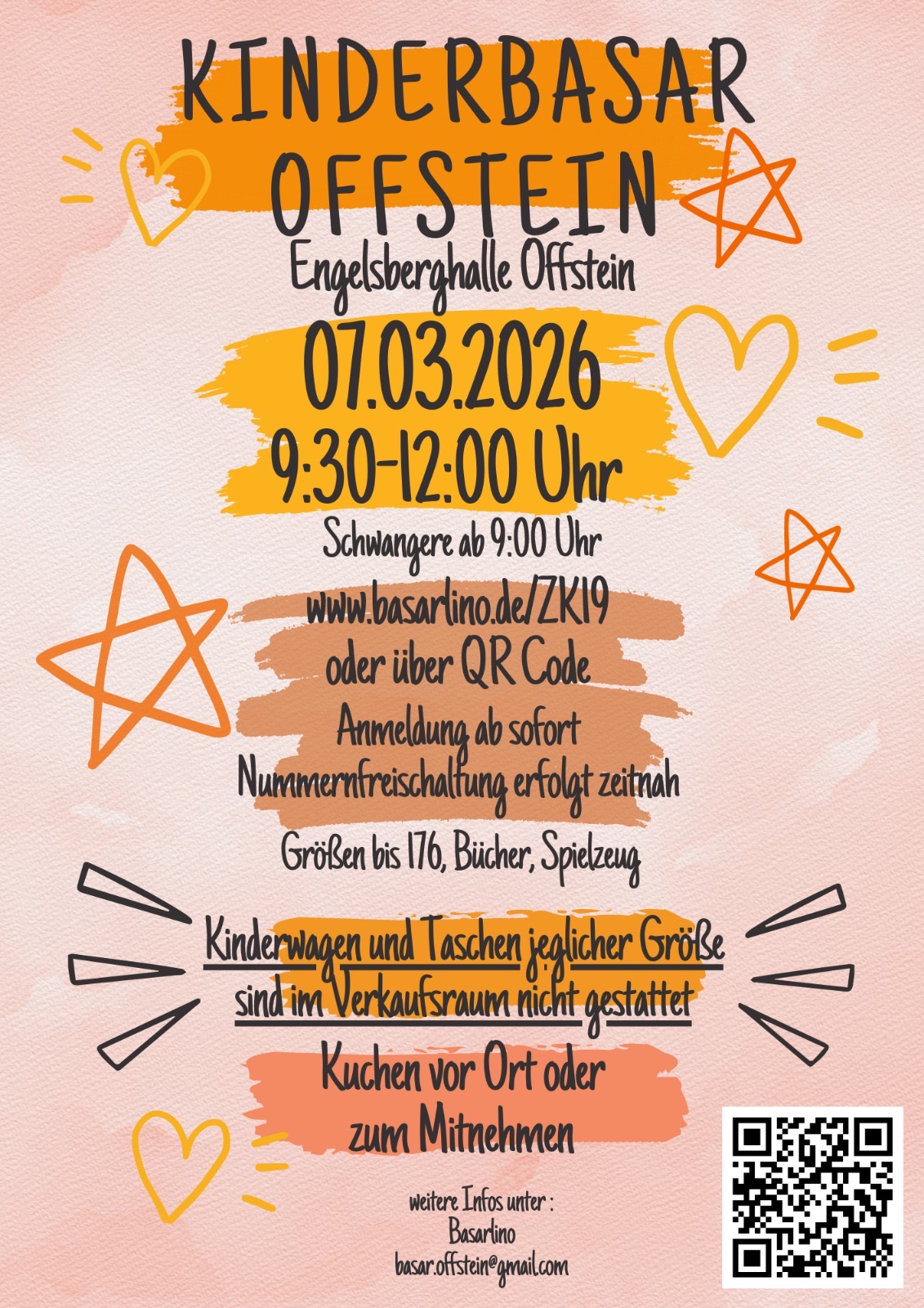 Am Samstag, den 07. März 2026, ist es wieder soweit: In der Engelsberghalle Offstein öffnet von 9.30 bis 12 Uhr unser beliebter Kinderbasar seine Türen.