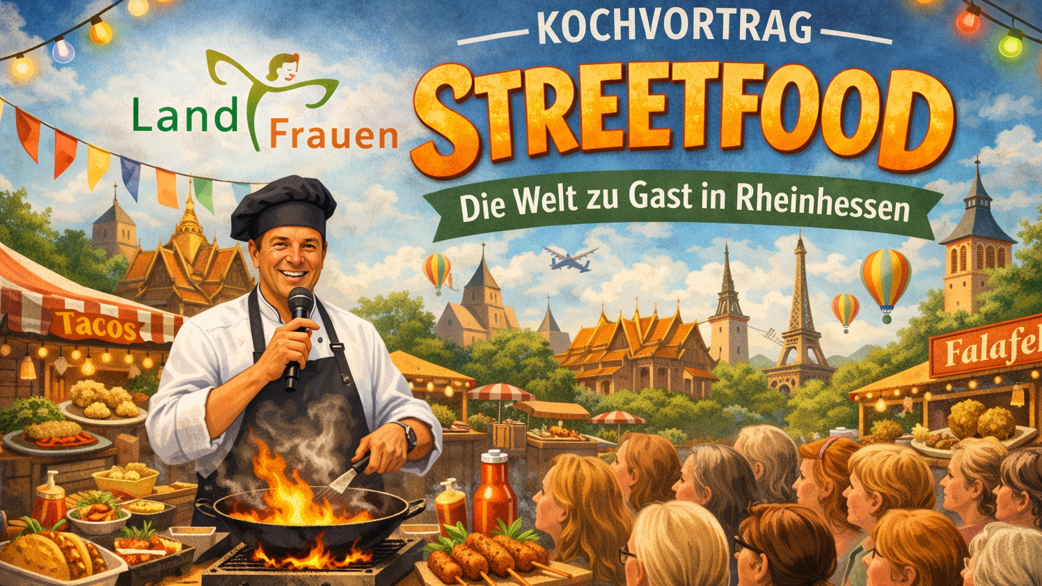 Kochvortrag von Karin Hartenbach zum Thema "Streetfood- Die Welt zu Gast in Rheinhessen" Tipps für eine ernährungsbewuste Zubereitung mit außergewöhnlichen, neuen Rezepten Wann? Donnerstag, 5. Februar 2026 um 19 Uhr Wo? im Nebenraum der Engelsberghalle Anmeldungen bis spätestens 26. Januar 2026 bei Jacqueline Eberlein (06243 900720) Kosten: 5€ Unkostenbeitrag, 2€ für das Rezeptheft (vorab zu entrichten) Bitte mitbringen: Suppenteller, Teller, Dessterteller bzw. Kaffeegedeck sowie vollständiges Besteck