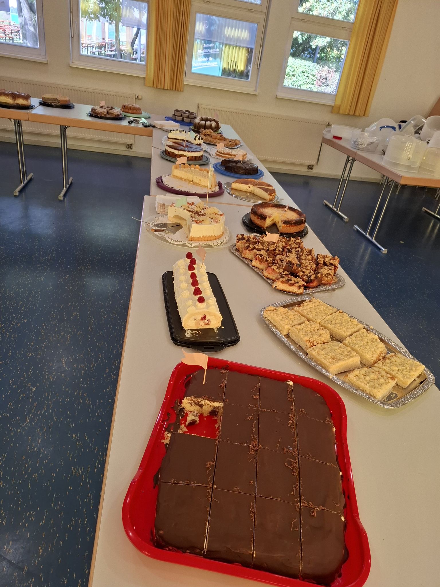 • Kuchenbuffet: Nach dem Umzug wartete unser vielseitiges Buffet im Nebenraum der Engelsberghalle. Die Auswahl fiel nicht leicht: Dank der vielen fleißigen Bäckerinnen und Bäcker konnten wir 15 Torten sowie rund 20 Obst-, Käse- und Rührkuchen anbieten.