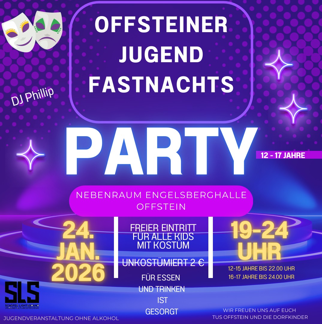Am Samstag, den 24.01.2026, findet im Nebenraum der Engelsberghalle die große Fastnachtsdisco für alle Teenies von 12 bis 17 Jahren statt.