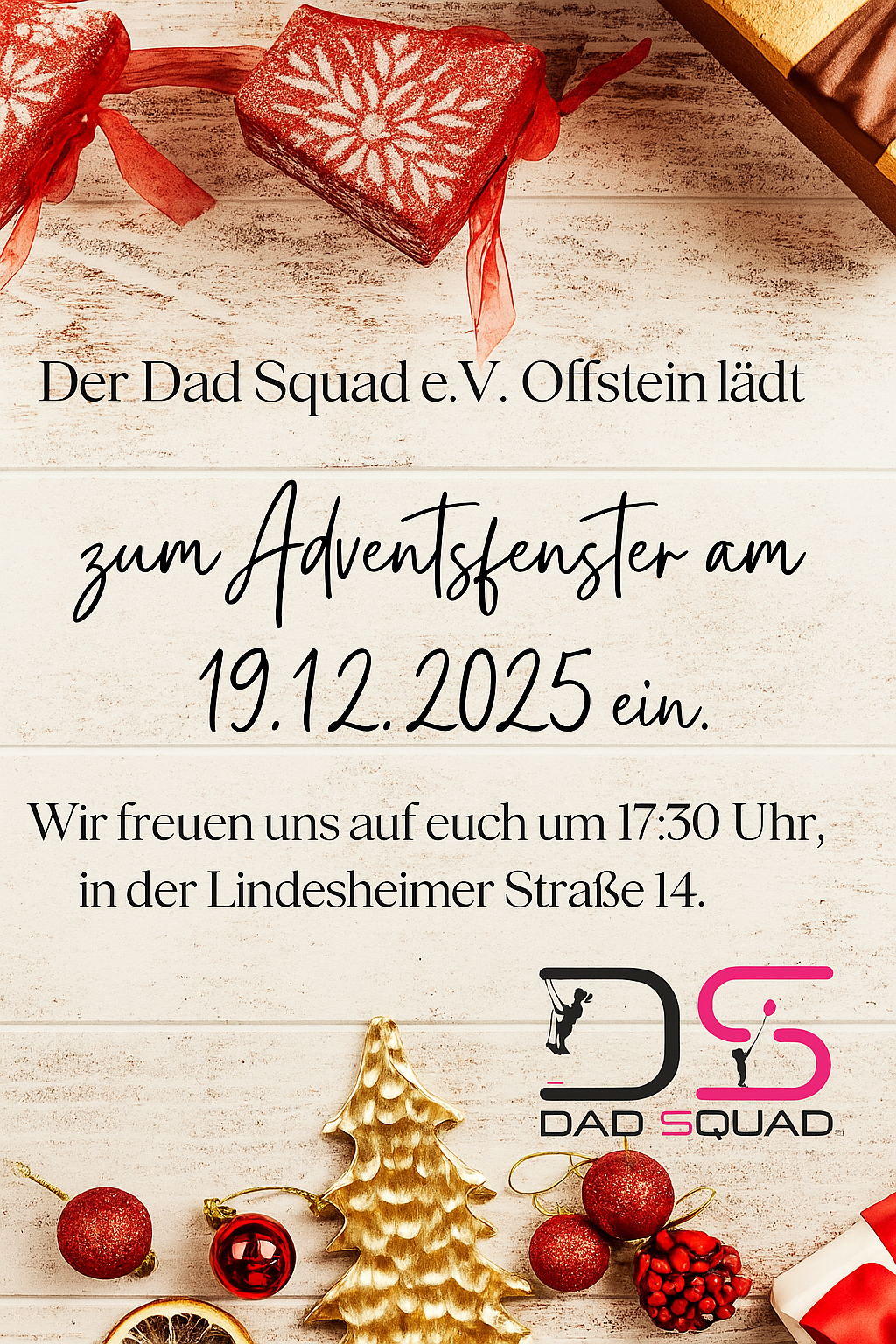 Wir laden euch herzlich ein, am 19. Dezember bei unserem Adventsfenster in der Lindesheimer Straße 14 vorbeizuschauen.In gemütlicher Atmosphäre möchten wir gemeinsam ein bisschen Adventsstimmung genießen, ins Gespräch kommen und einfach einen schönen Abend miteinander verbringen - ganz ohne Stress und Hektik.Ob Papa, Mama, Oma, Opa, Freunde oder Nachbarn - alle sind herzlich willkommen, eine kleine Pause vom Alltag zu genießen, zu plaudern, zu lachen und die Vorweihnachtszeit in angenehmer Atmosphäre zu erleben.Wir freuen uns riesig auf ein freudiges & herzliches Beisammensein mit euch!euer Dad Squad e.V.