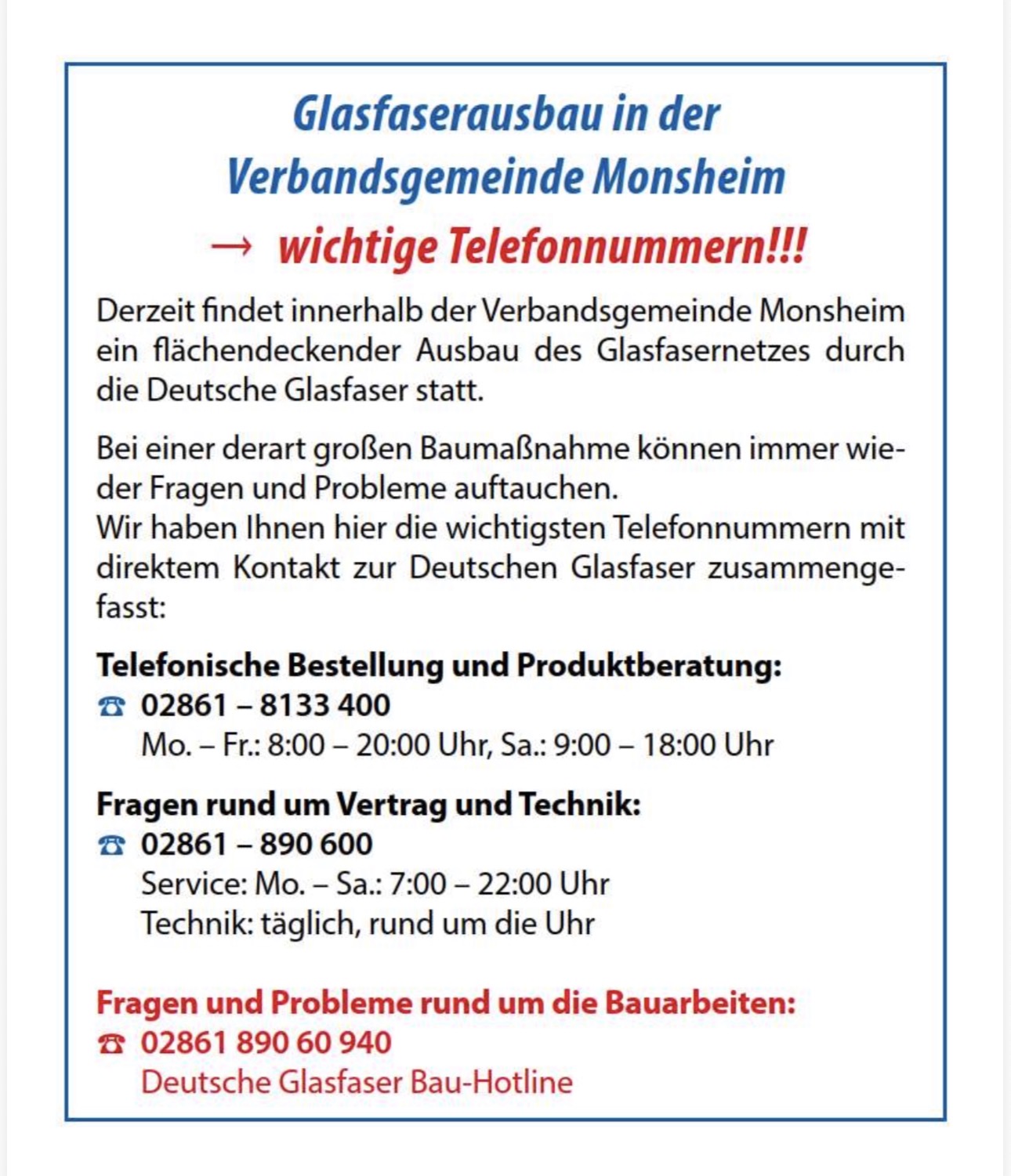 Die Deutsche Glasfaser (DG) baut derzeit unser Ort mit Glasfaser aus. Alle Haushalte, die einen 24‑Monatsvertrag mit der Deutschen Glasfaser abgeschlossen haben, erhalten im Rahmen dieses Vertrags den Glasfaser‑Hausanschluss kostenlos.