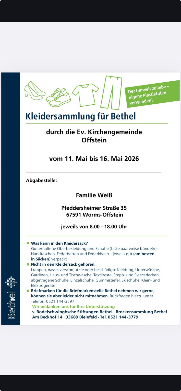 Bei uns in Offstein findet die Sammlung vom 11. - 16.05. bei Familie Weiß in der Pfeddersheimerstr. 35 statt.